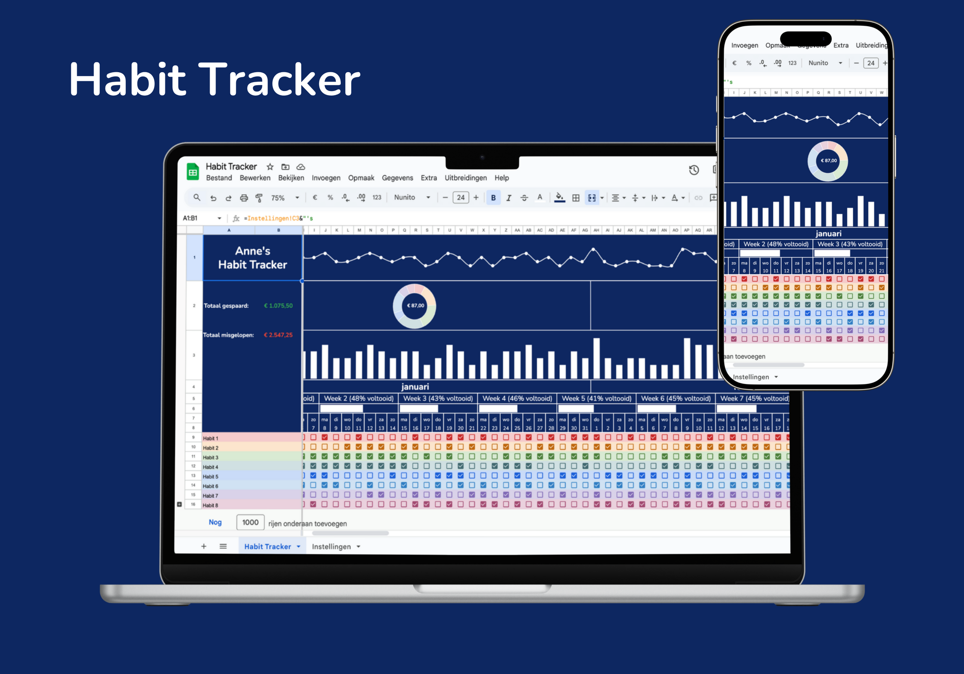 Wil je eindelijk die gezonde gewoontes vasthouden en je doelen bereiken? Met deze Habit Tracker in Google Sheets krijg je grip op je dagelijkse routines en zie je direct je voortgang!